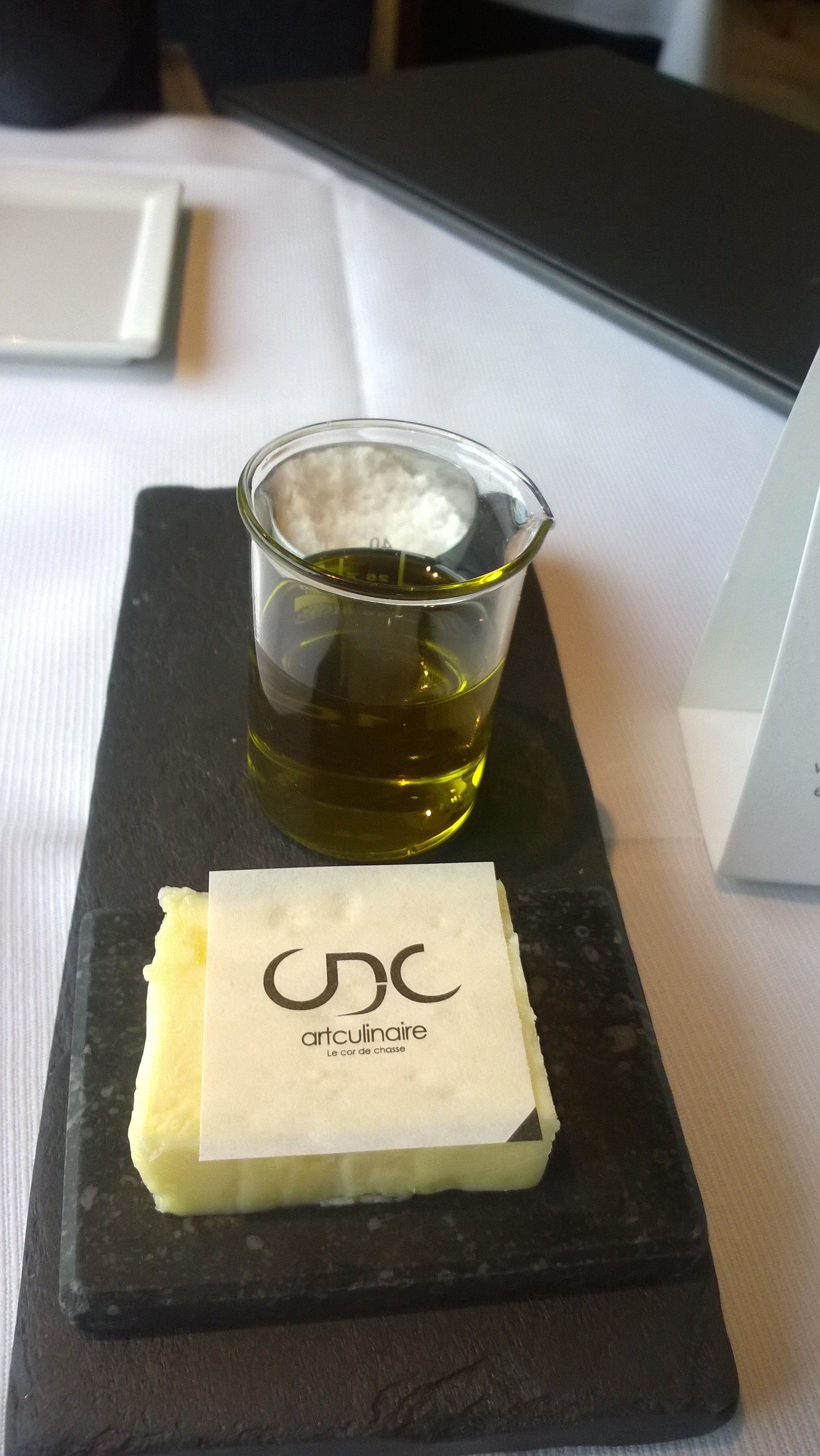 Het restaurant gedeelte ziet er alvast veelbelovend uit. Het is prachtig ingericht, is ruim en overzichtelijk. Niet te druk zodat niets een interessante conversatie met je disgenoot je in de weg staat. Zoals praktisch overal in de gereputeerde zaken staan er jonge mensen in voor de bediening. Uiteraard om de nodige ervaring op te doen en hun cv aan te dikken. Terecht overigens. De dienster bezat de nodige humor en deed haar job perfect. De sommelier stelde met veel passie zijn keuze van aangepaste wijnen voor.