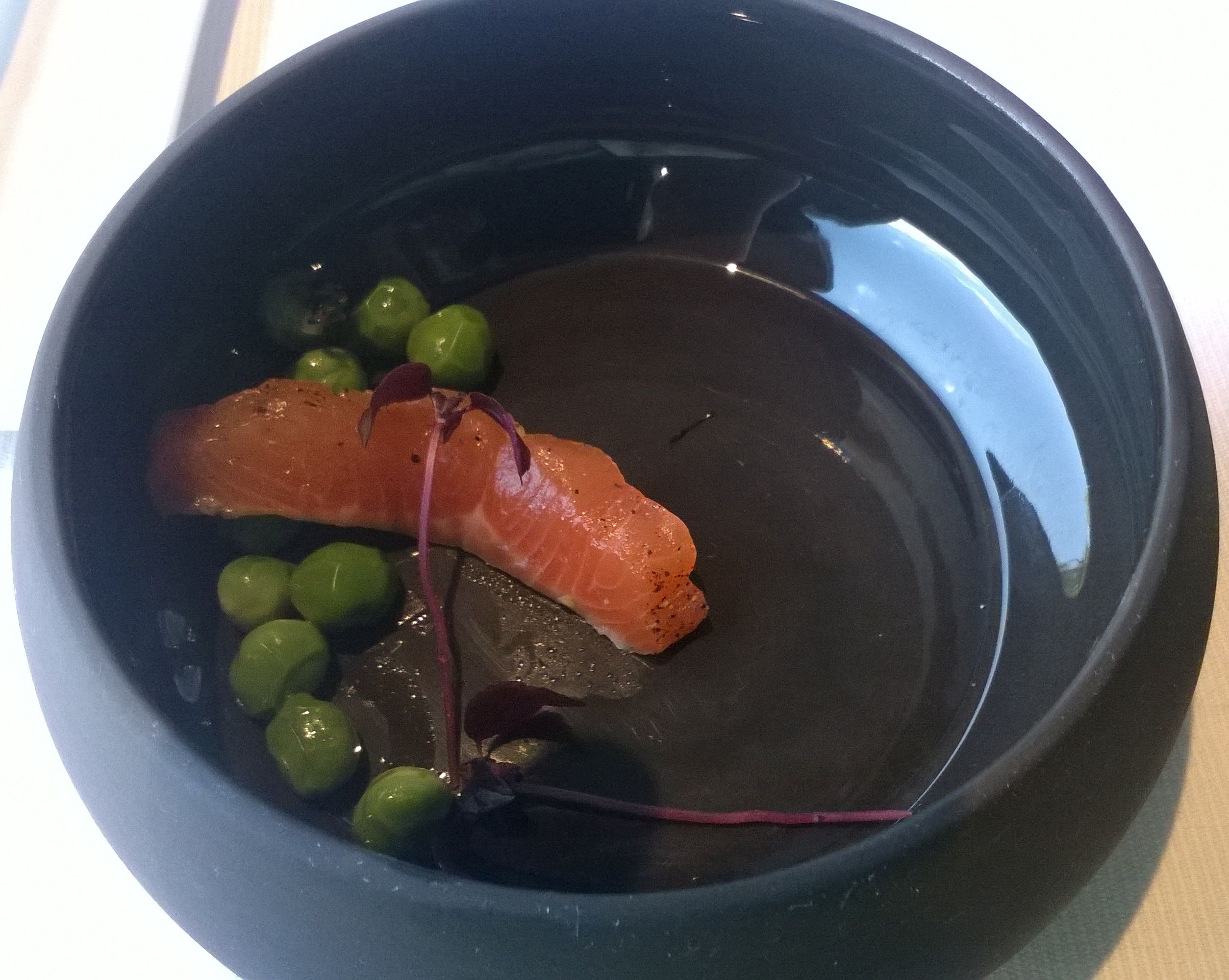 Hapje 2 – Zalm / Erwt. Zeer basic gepresenteerd maar dat deed de smaaksensatie geenszins verbleken.