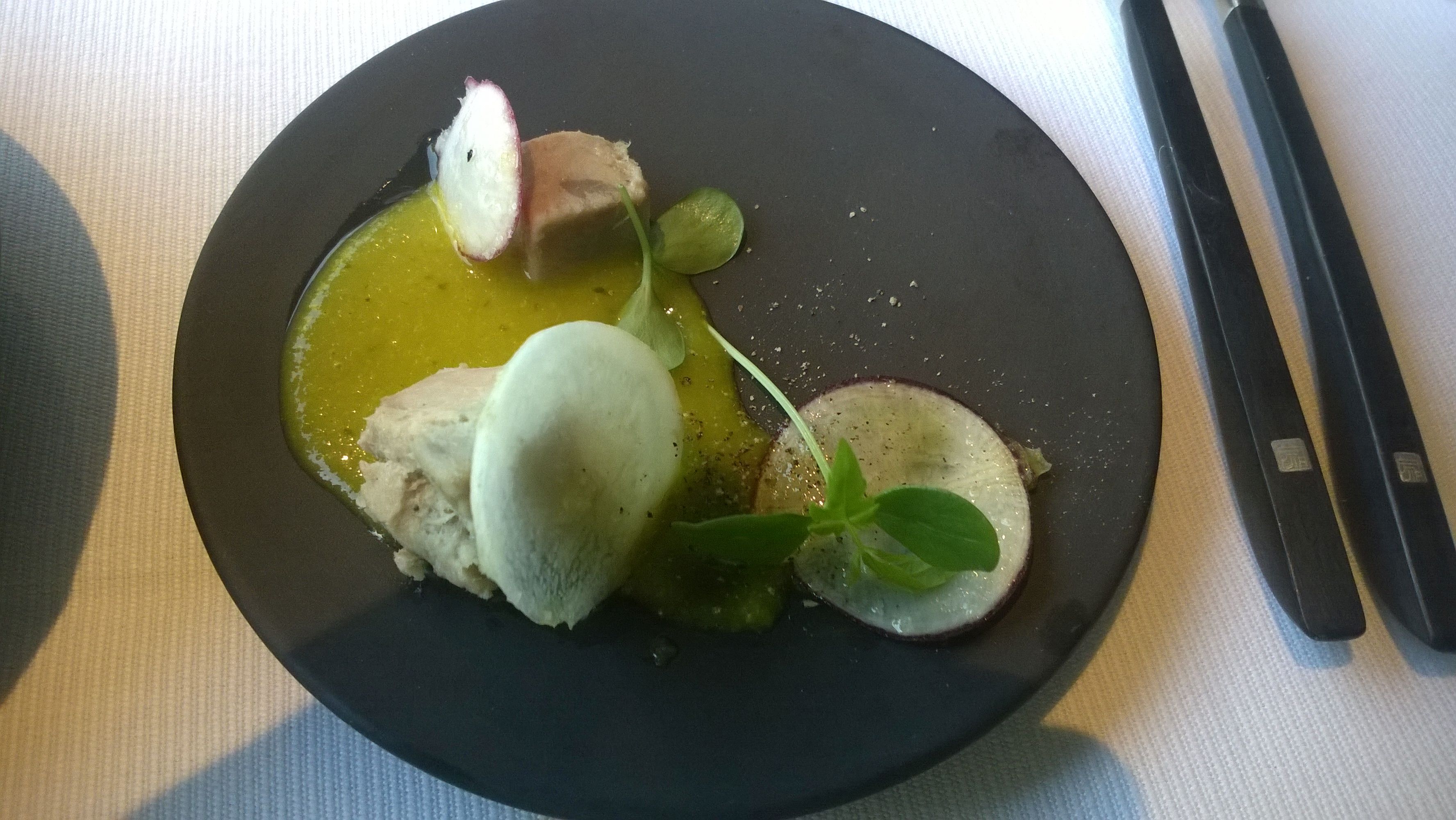 De lunch was van hetzelfde niveau als het diner en laat je afsluiten met het gevoel van… Ja dit was zeer de moeite. Het was prachtig weer die dag en dus konden we in alle rust nog napraten op het terras met een mooi flesje dat ik op de kaart zag staan en die steeds wel in mijn eigen keldertje ligt. De Rémus Plus Montlouis van Domaine de la Taille aux Loups.
