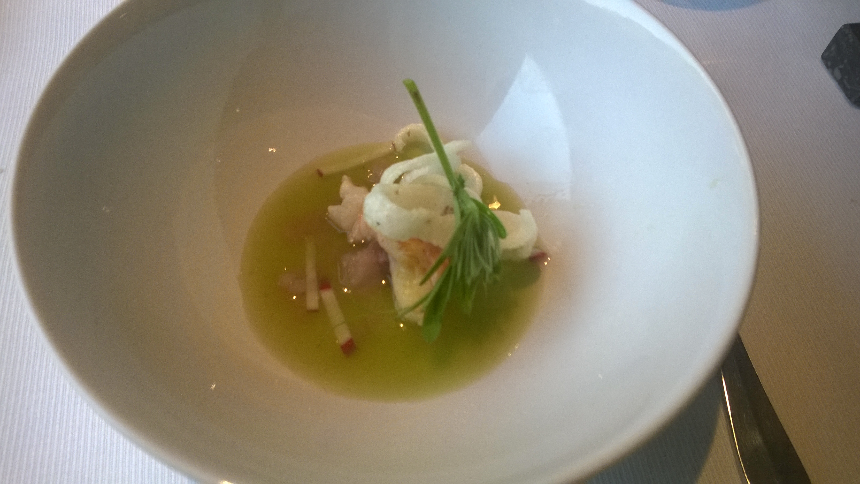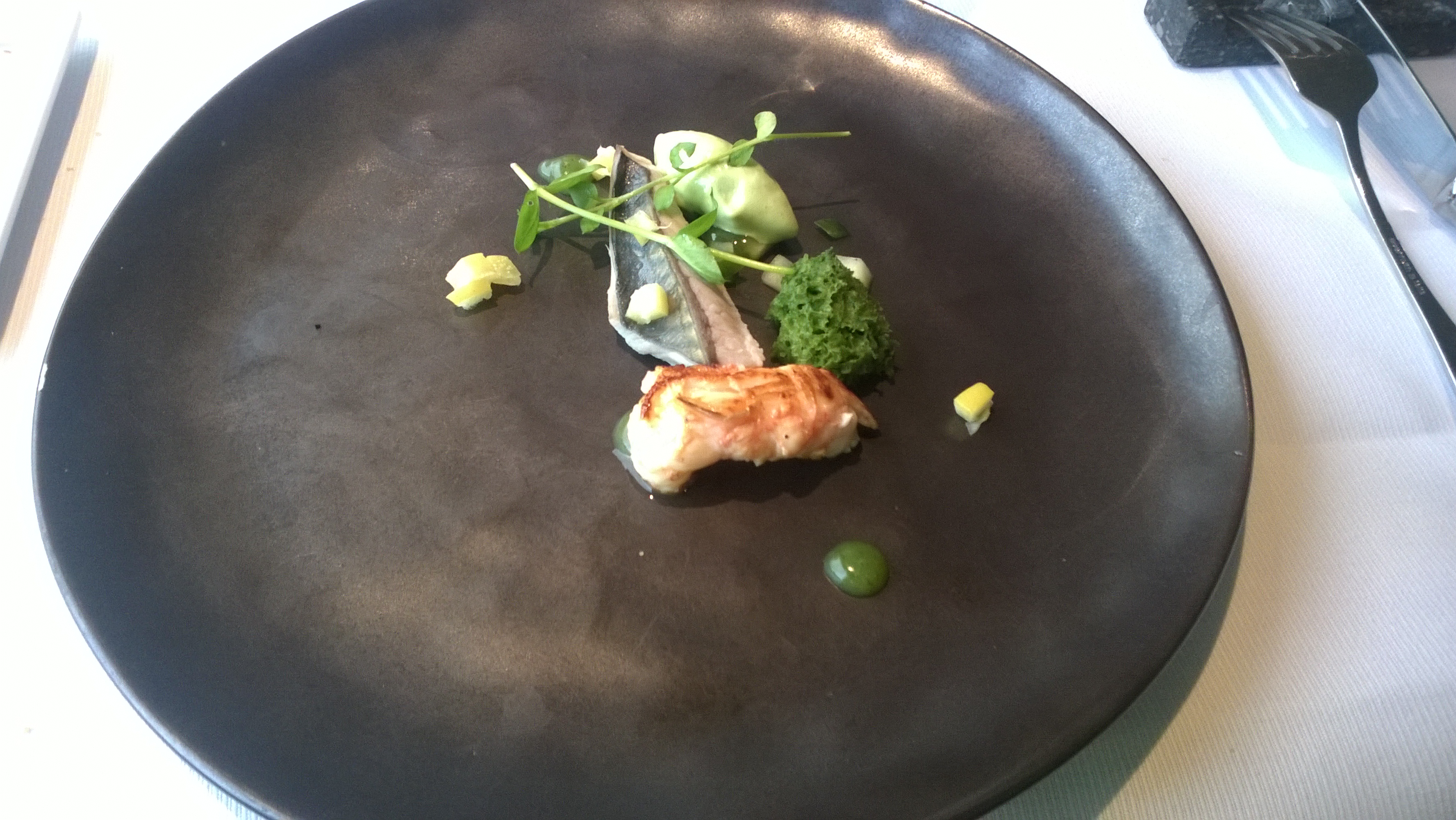 Leuk en verrassend, wegens niet aangekondigd, was dat er een tweede bordje kwam op basis van makreel en langoustine. Dit was volledig anders dan de eerste versie. Zeer intens en fris smaken en lang uitdeinend. De jus is gewoonweg top en geeft het geheel een heerlijke smaaksensatie.