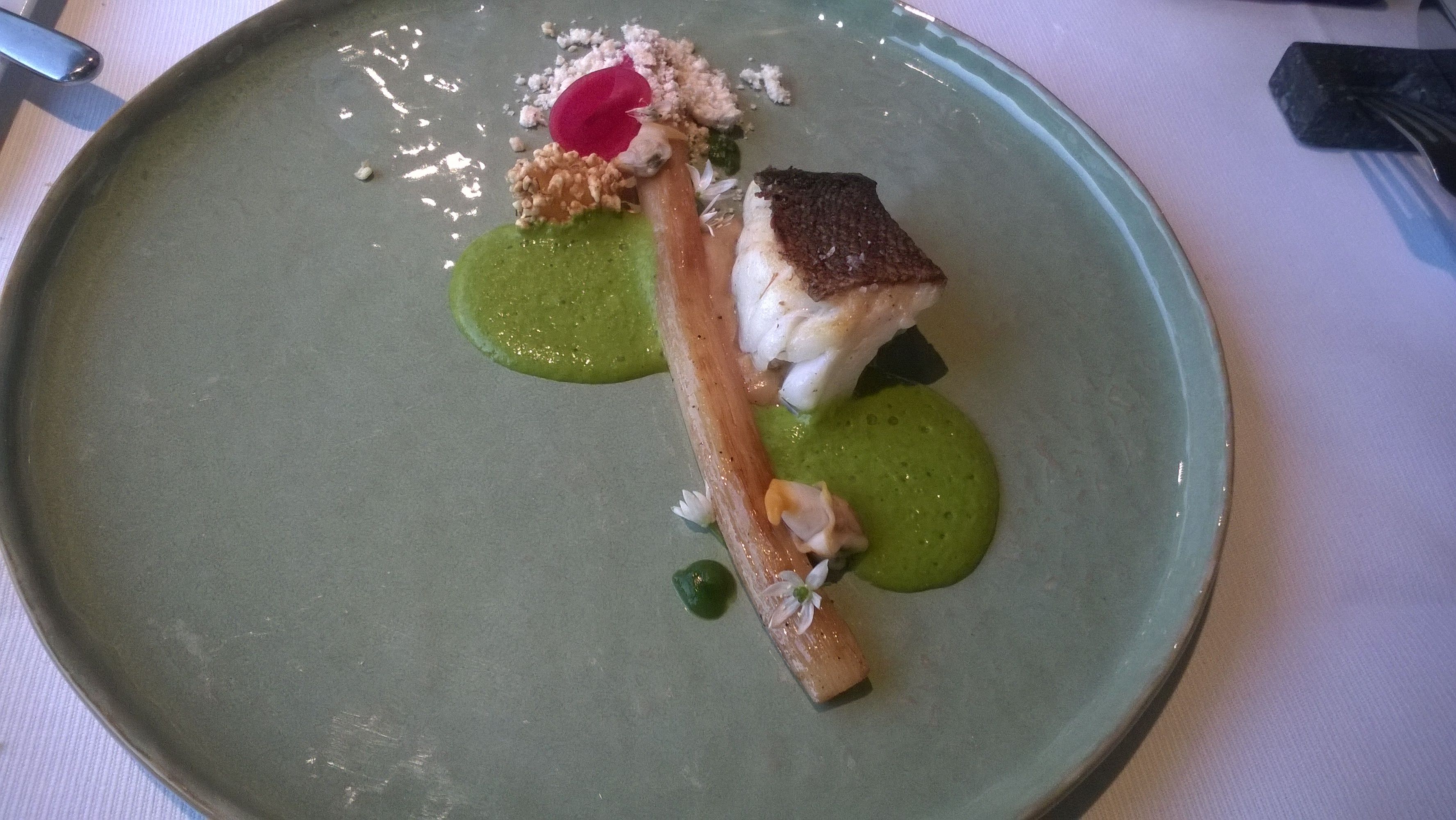 Het poeder van spek en de daslook vullen geweldig aan. De vis kan niet beter gegaard zijn. Het geheel is een heerlijk samenspel van smaken. Rijkelijk en fris!