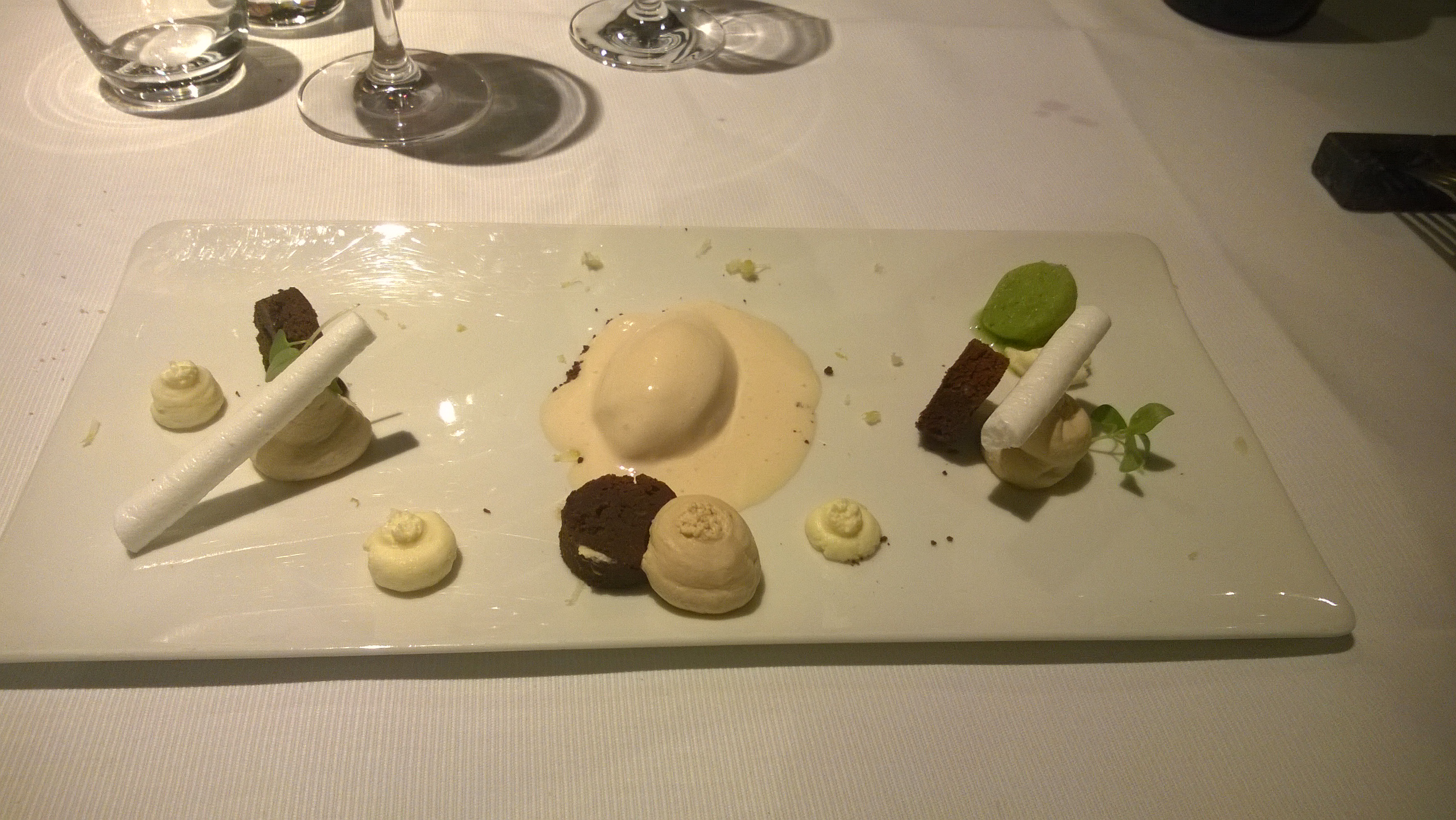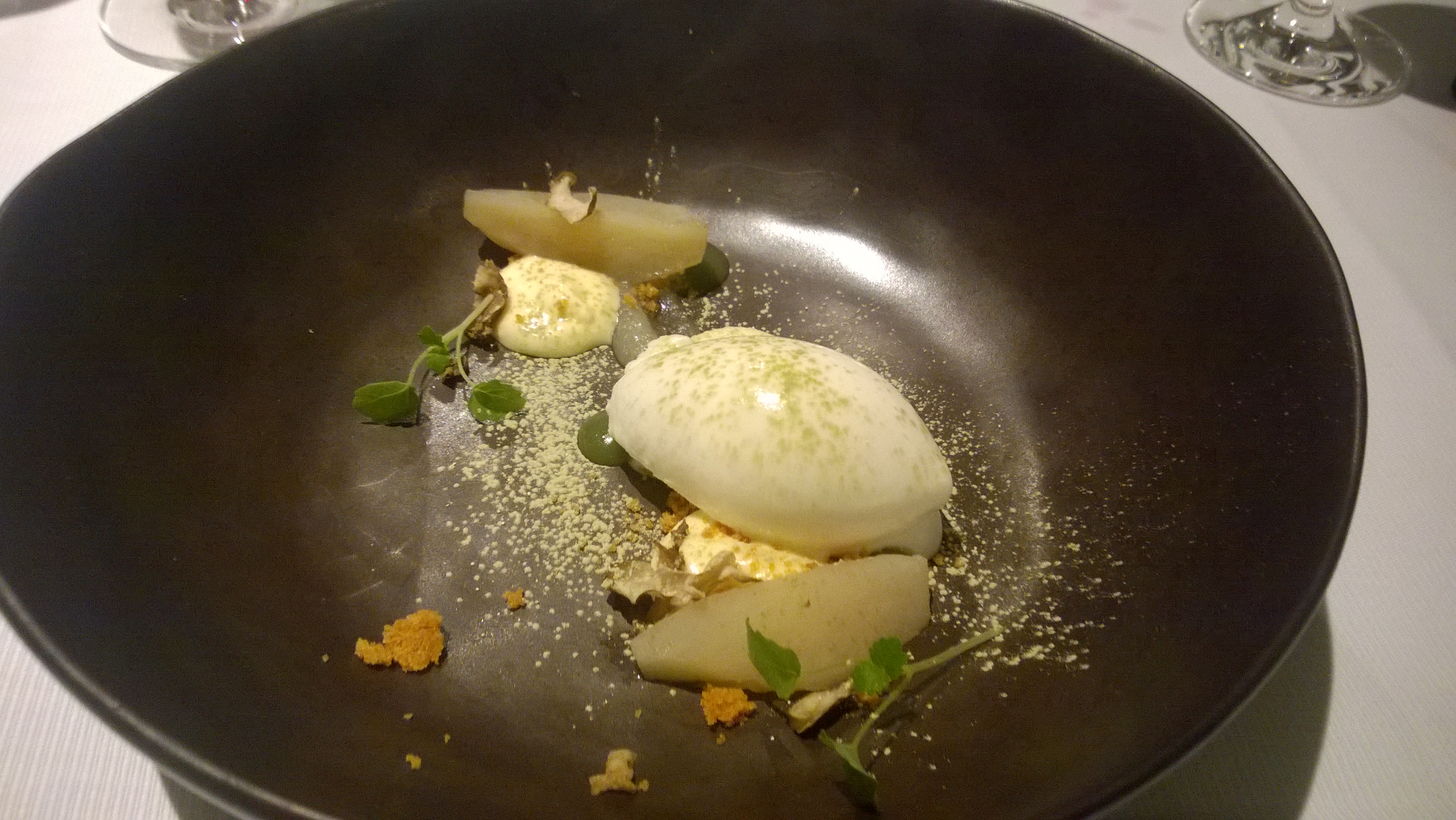 Wat de aardpeer erbij kwam zoeken is me een raadsel, we vonden beiden dat dit afbreuk deed aan het bord en de smaak. Dit dessert was duidelijk het minste gerechtje in het geheel.