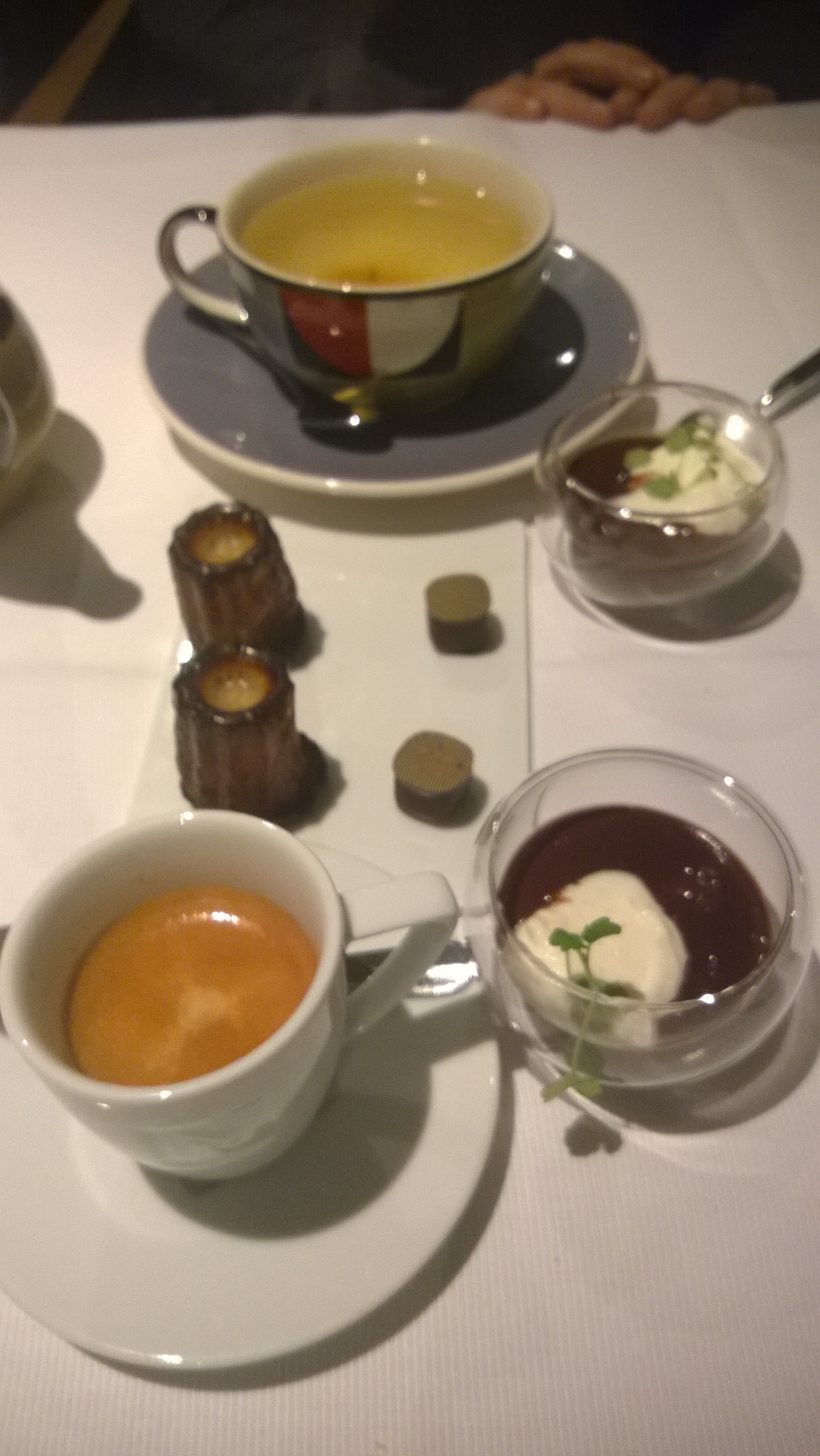 Tenslotte was er uiteraard nog de koffie en thee. Passend in het geheel werd hierbij afgerond zoals we gestart waren. Met twee bordjes op basis van agrum en chocolade. Beiden deden het mindere dessert onmiddellijk vergeten.