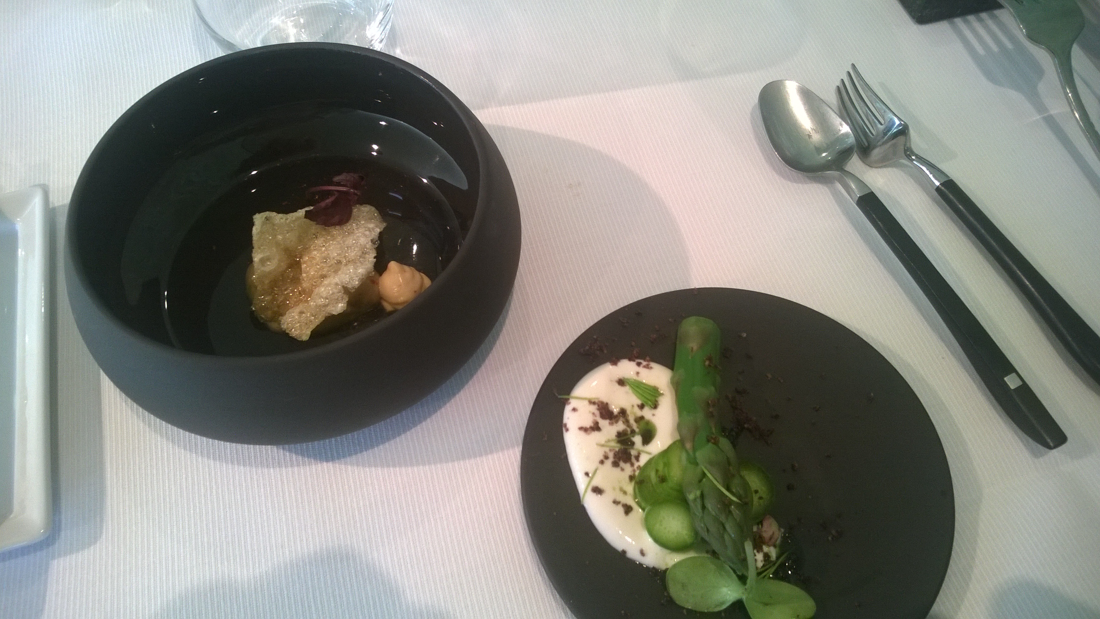 Gang 2 – Poisson du jour / asperges / poudre de collonata / coques / émulsion d’ail des ours / pommade de jaune d’œuf