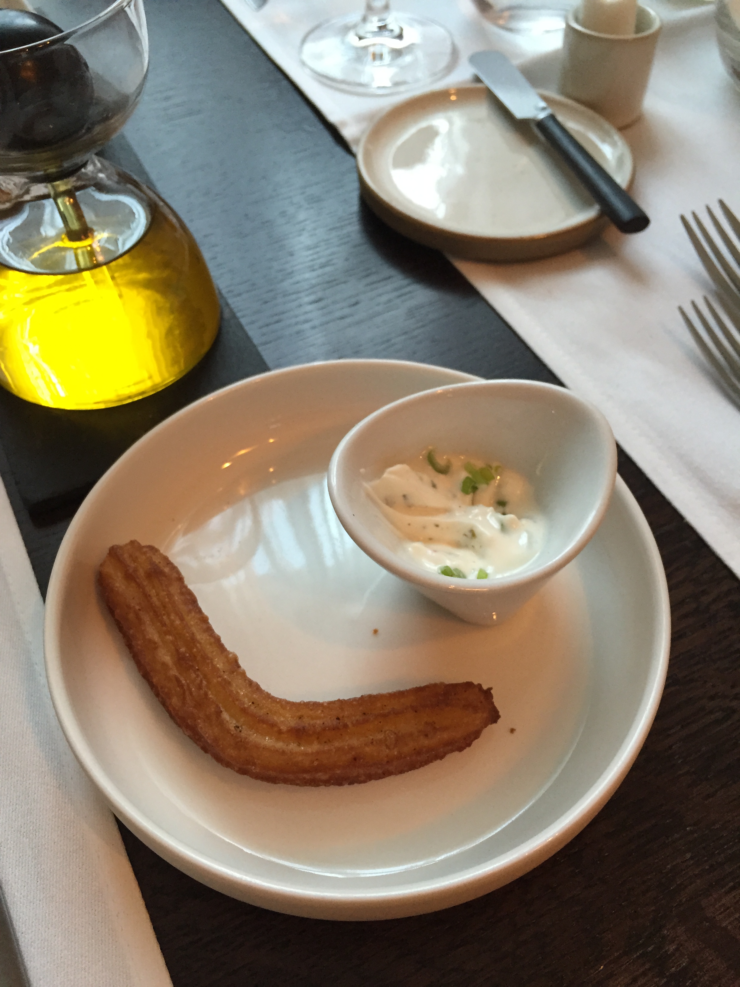 Jan & Karoline opteren er voor alles zelf te doen en houden daardoor de kaart beperkt. Het aangeboden ‘100% Ons‘ menu laat je kiezen uit 3 – 4 of 5 gangen. Indien gewenst kan er nog een extra kaasbordje tussen geplaatst worden. We konden ons helemaal vinden in het voorgestelde menu en opteerden bijgevolg voor de 5-gangen. Prachtig was de keuze voor de huisaperitief ‘Pisco Sour‘. Zowel Peru als Chili bekvechten om de afkomst van deze cocktail die als basis de Pisco (een distillaat van druiven) heeft en aangevuld wordt met limoensap, rietsuiker, opgeklopt eiwit en een bittertje (Zou men Angostura gebruikt hebben? Dit ben ik vergeten te vragen). Gezien het hele gezelschap dit nam bleef ik dan toch maar ouderwets bij mijn 6 moments Gin Tonic. Een passende gin voor dit restaurant uiteraard. Bovendien kon ik naar hartenlust mee proeven van de uitstekende Pisco Sour. Al vlug had ik toch wel spijt hier niet voor gekozen te hebben.