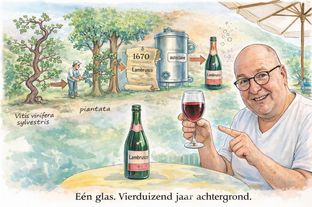 Voor mij maakt dat het slotbeeld helder. Lambrusco werd een klassieker niet door zijn wilde kant te verliezen, maar door haar te leren sturen. Eerst in de wijngaard, via selectie en ervaring, later in de kelder, via hergisting en gedurfde keuzes. En precies daarom kan Lambrusco vandaag opnieuw overtuigen: niet als zoet cliché, maar als een wijn met karakter, geschiedenis en een energie die je met open vizier moet ervaren.
