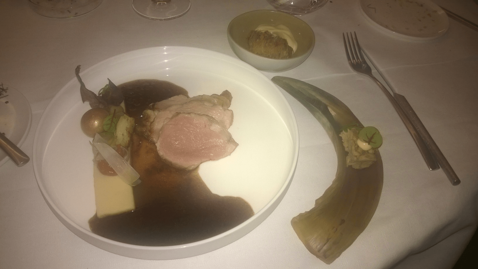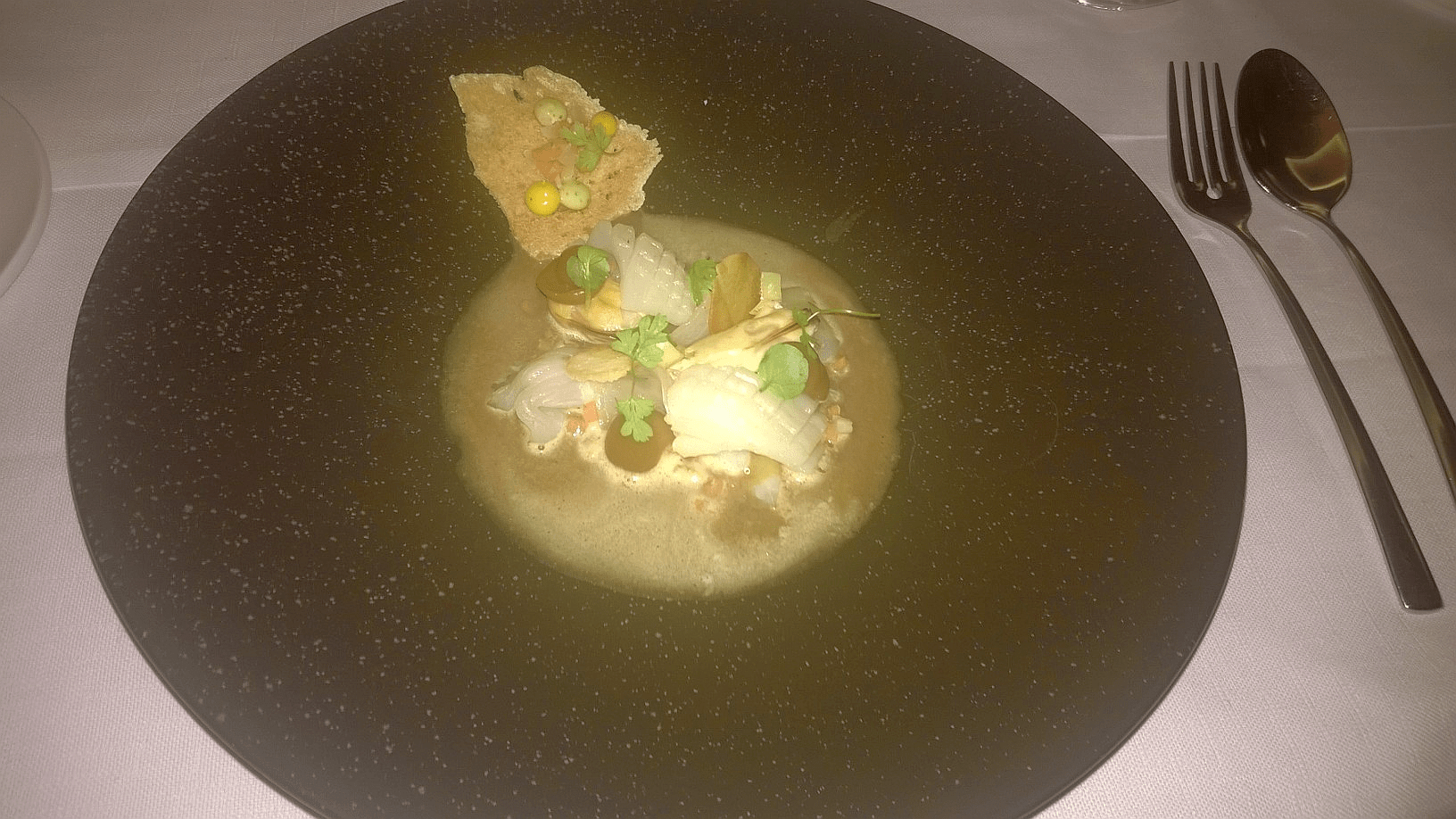 Het gepekelde groen in kwestie was komkommer en augurk. Wat een opener! De langoustine is gewoonweg perfect op smaak. De yoghurt van geitenmelk smaakt heerlijk in combinatie met de verjus (Verjus = het sap van onrijpe druiven dat in de keuken als vervanger van azijn wordt gebruikt). Het volledig gerechtje biedt een heerlijk samenspel tussen de bittere toetsen, de fraicheur en de knapperigheid. De nootjes verwerkt in het gerecht brengen bovendien een speelsheid erbij.