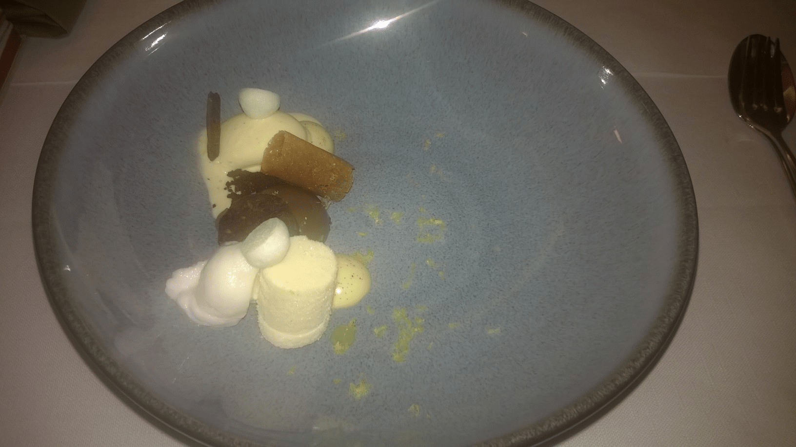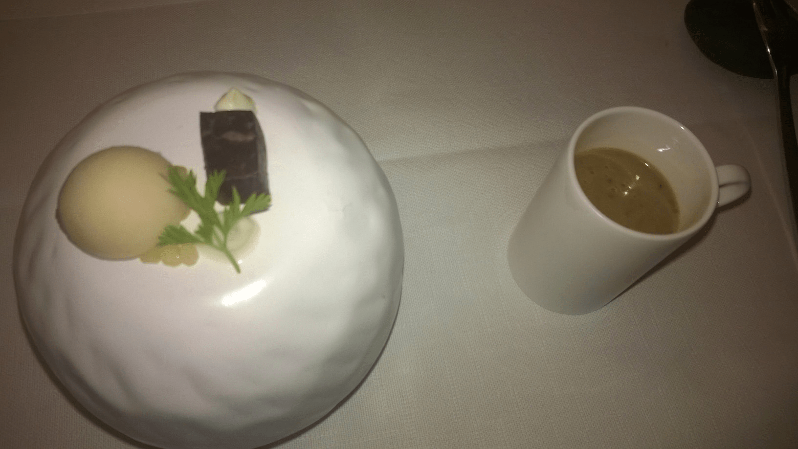 Mee verwerkt in het dessert: Schaafsel van bergamot en chocolade. Een constante frisheid zit er doorheen het ganse dessertje en zo hoort het ook. Het verveelt je dan ook geen seconde en dat is toch wel een compliment van iemand die doorgaans geen dessert liefhebber is.