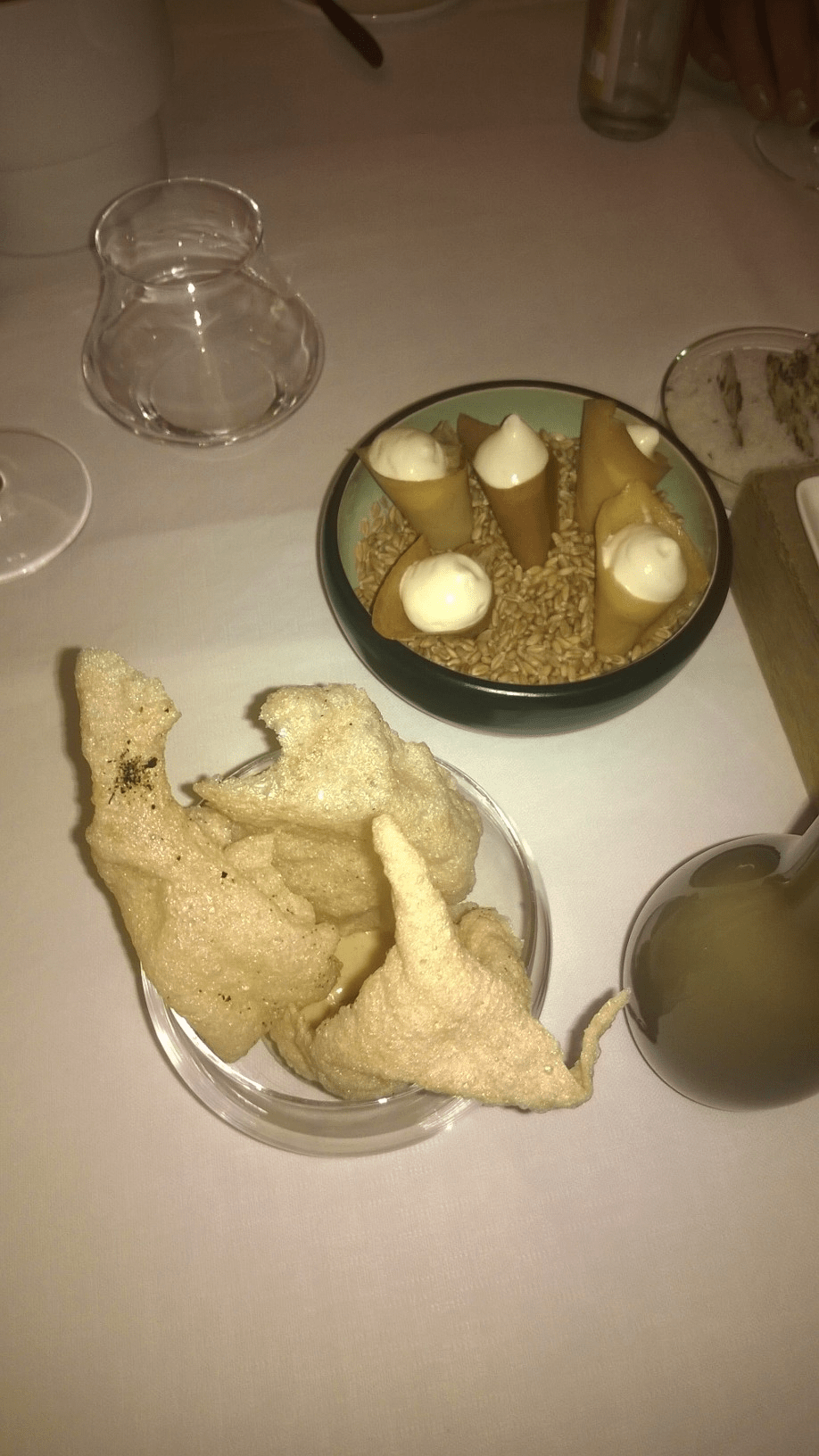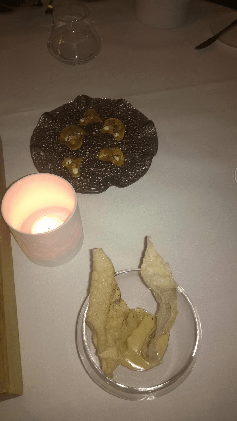 Aperitief werd de Eskimo Gin Ungava met een Fentimans Tonic. De bijpassende hapjes kwamen al gauw. Het goedkeurend gegrom aan de tafel deed ons snel de afgelopen negatieve ervaring vergeten. We wisten dat we goed zaten! De bordjes en de inhoud maakten het tekeningetje wel. De hapjes waren zeer lekker en gevarieerd. Leuk was bovendien de brood en boter variatie.